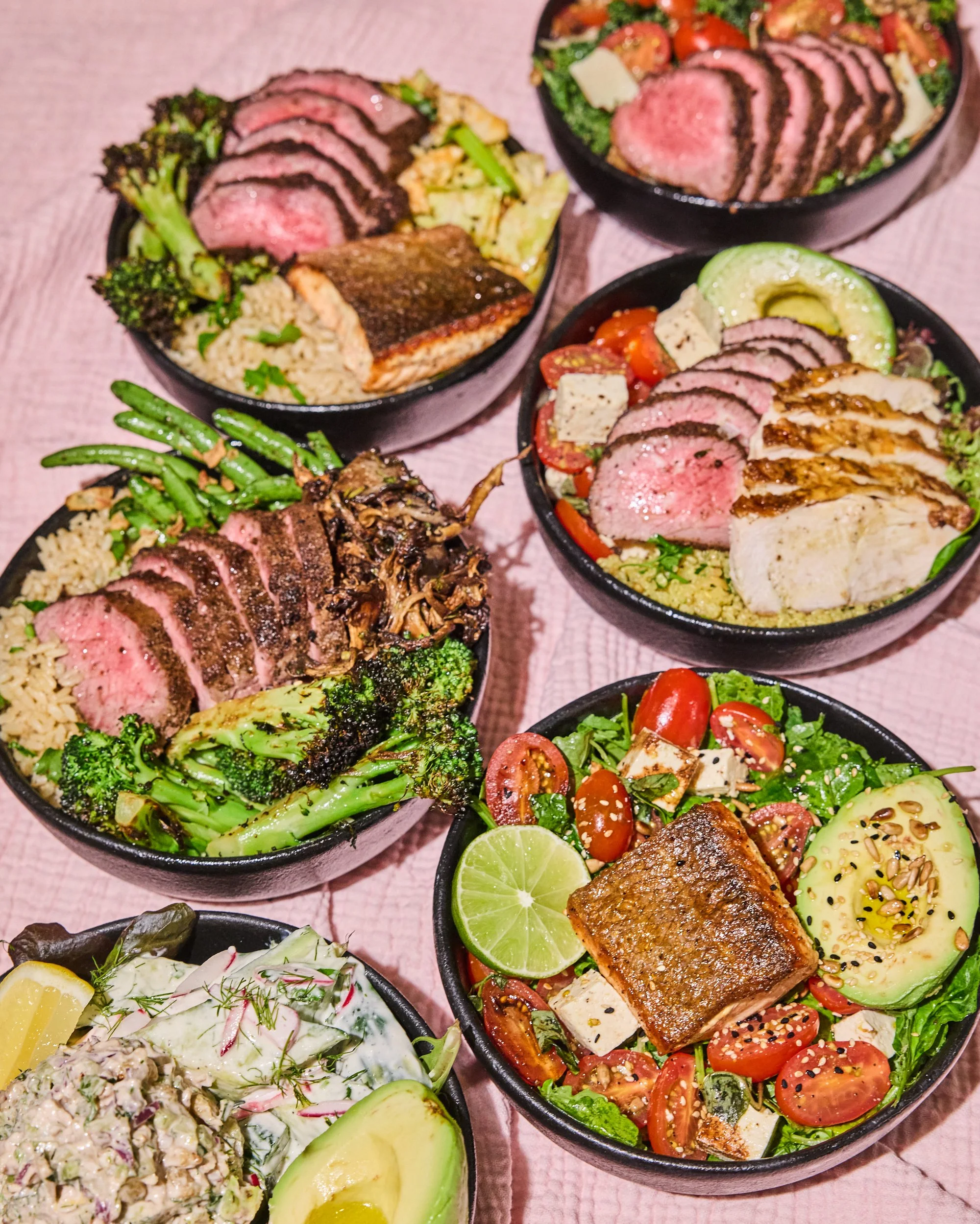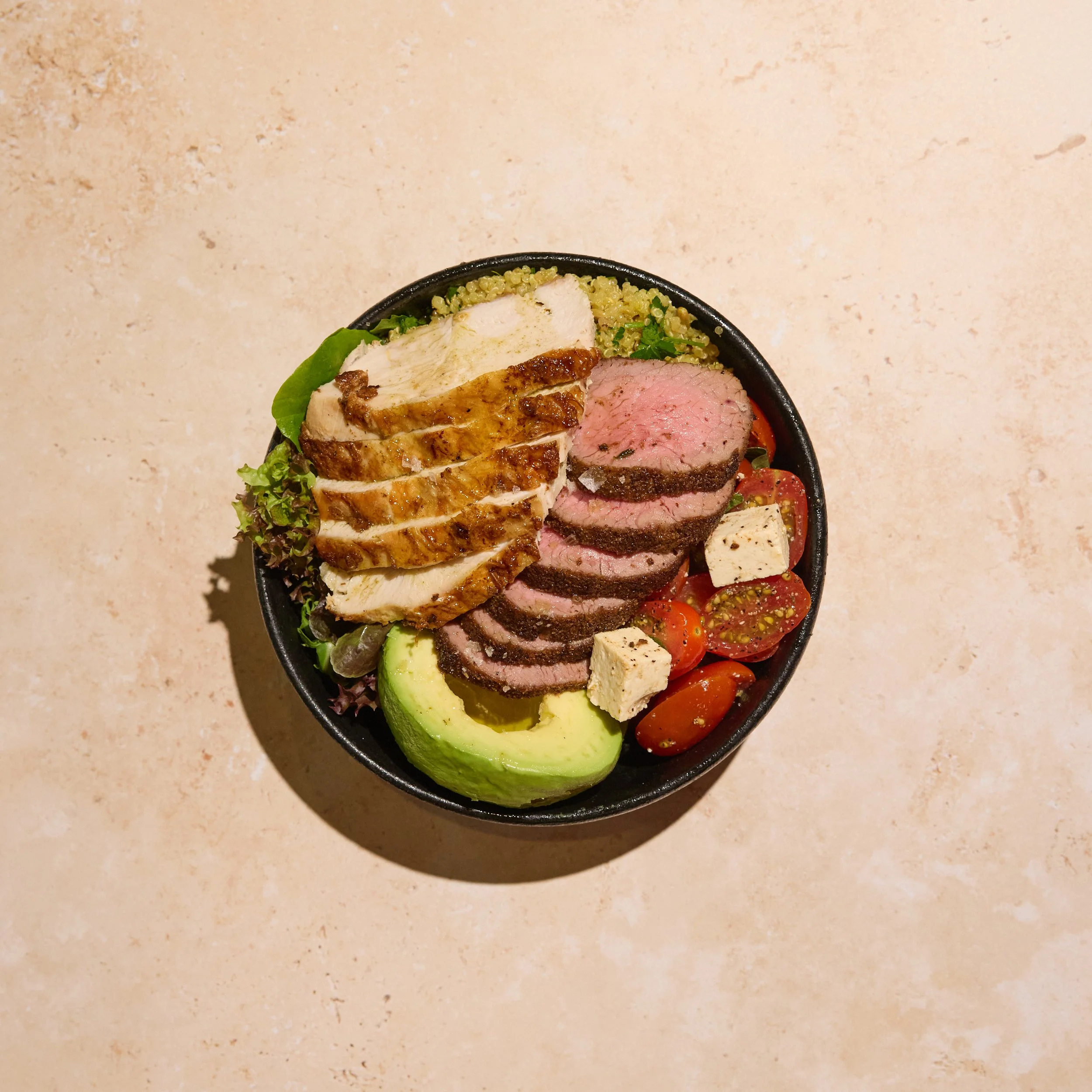 Grass-fed Steak, Rosemary Roasted Chicken Breast, Tomato Tofu Caprese Salad, ½ Golden Quinoa, ½ Farm Greens, Half Avocado, Basil Pesto (Un)dressing.