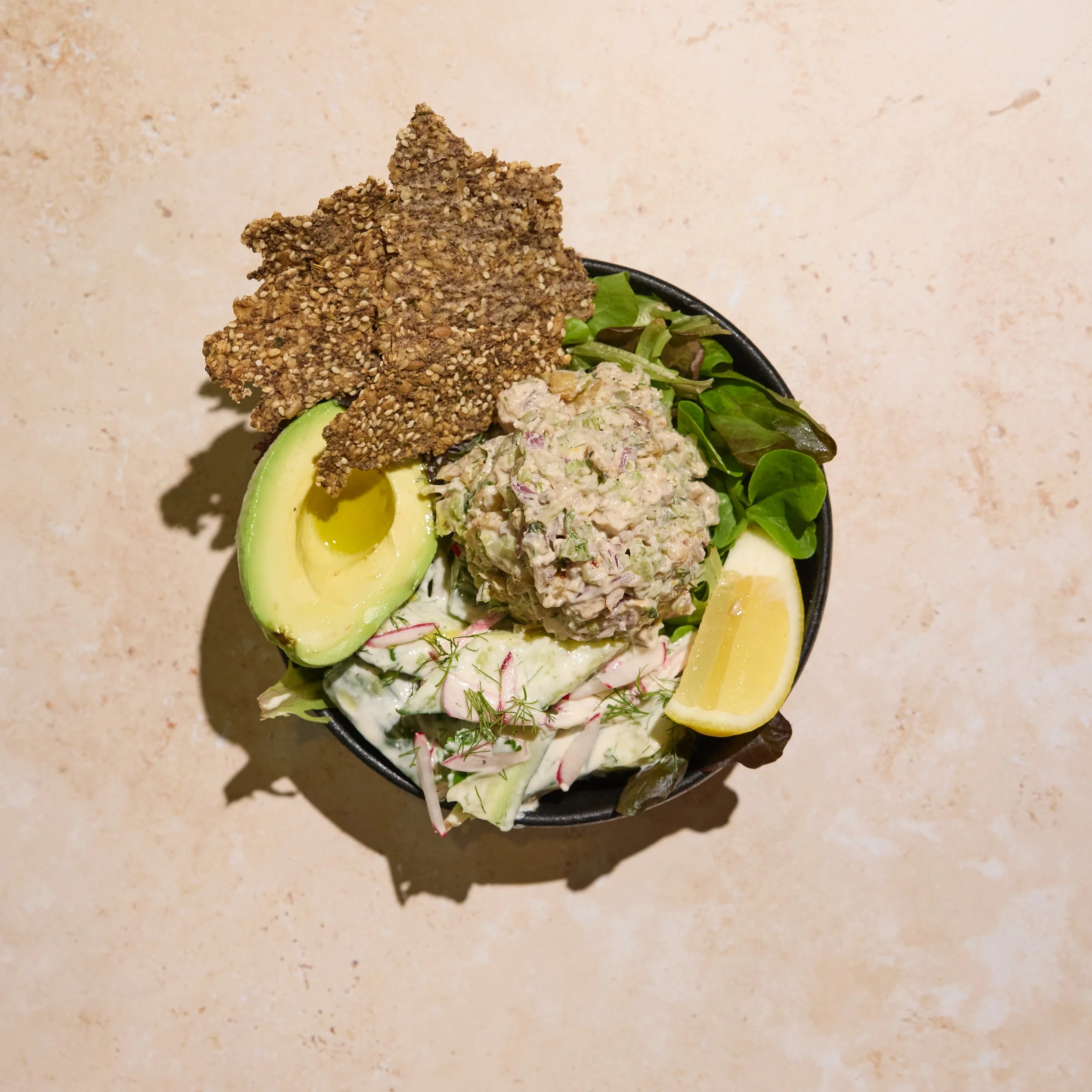Chicken Waldorf Salad, Farm Greens, Cucumber Ranch Salad, Half Avocado, Naked Crisps, Lemon Wedge, White Balsamic Vinaigrette (Un)dressing.
