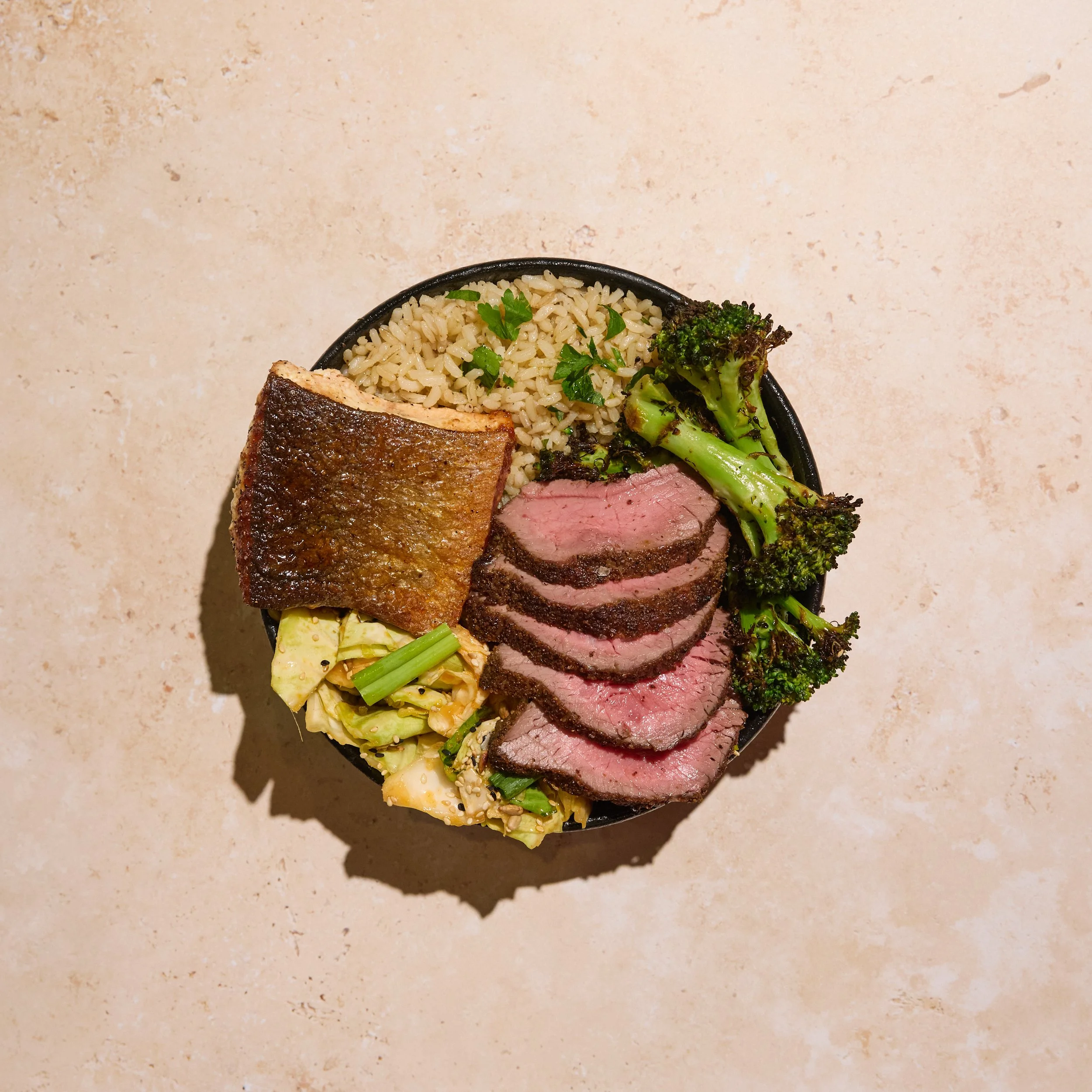 Grass-fed Steak, Faroe Island Salmon, Spring Garden Kimchi, Charred Broccoli with Lemon & Garlic, Brown Rice with Parsley, Spicy Miso Aioli (Un)dressing.