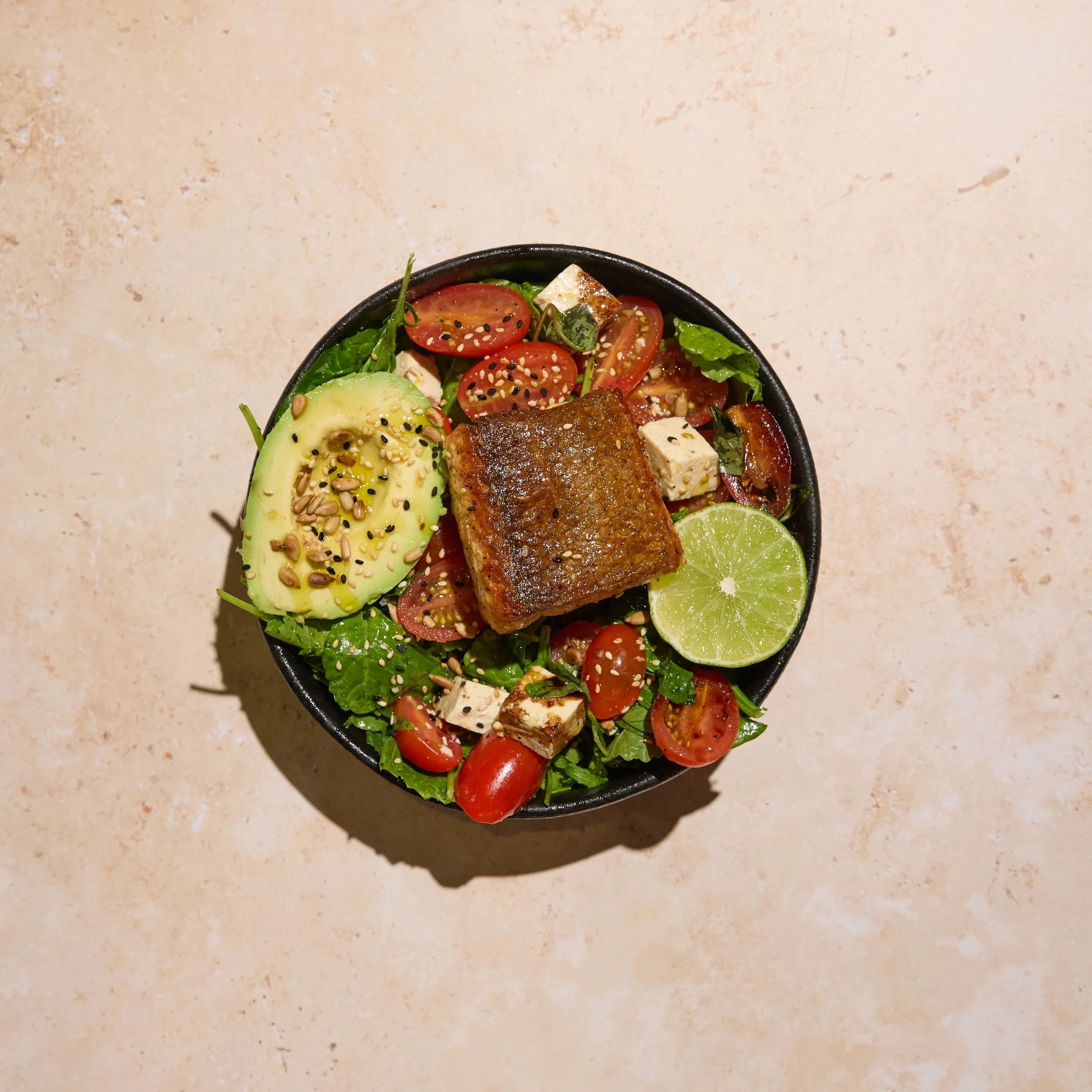 Faroe Island Salmon, Tomato Tofu Caprese Salad, Farm Greens, Half Avocado, Sesame Crunch, Spicy Miso Aioli (Un)dressing.