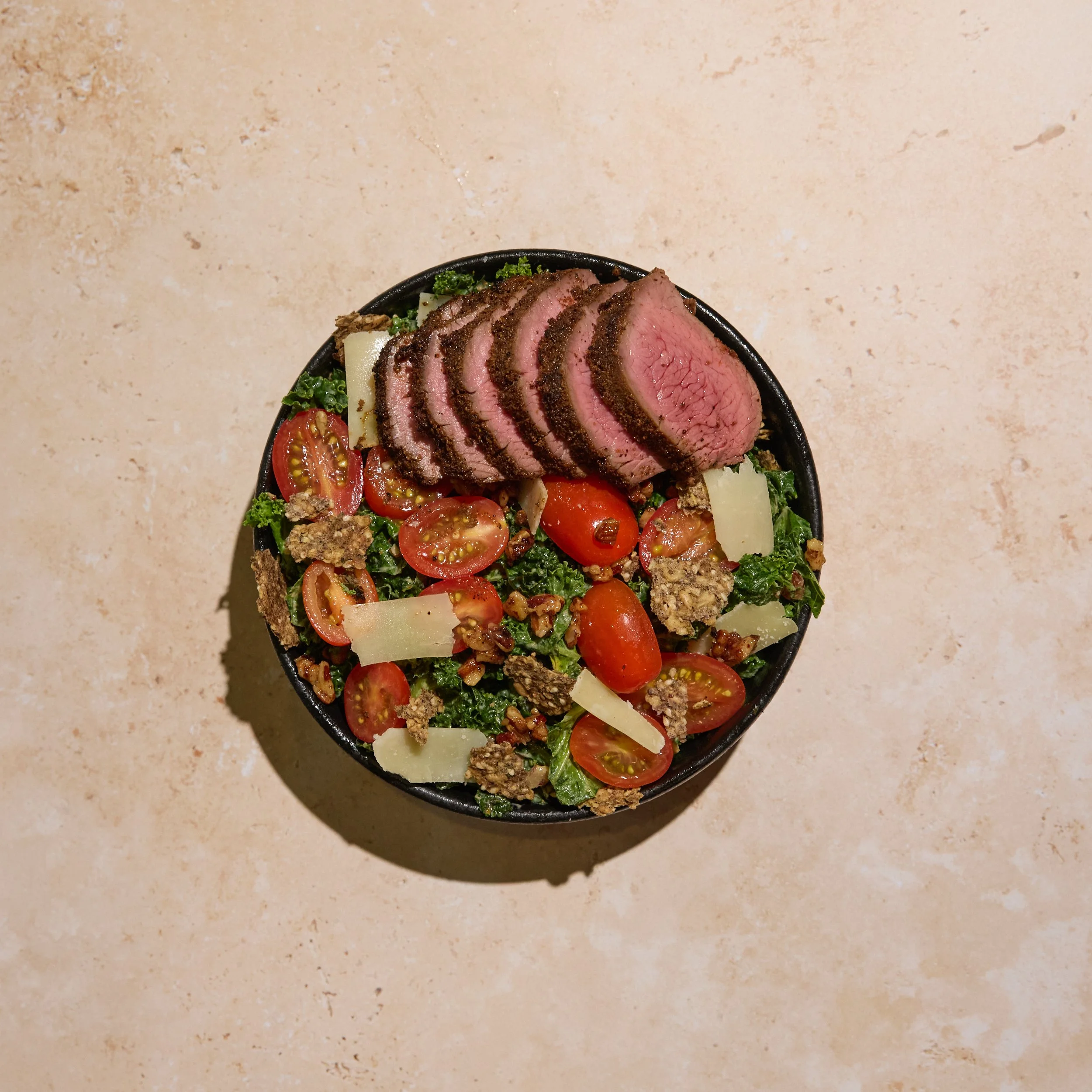 Grass-fed Steak, Pecan Kale Caesar, Seasoned Tomatoes, Naked Crisps, Green Goddess Caesar (Un)dressing.