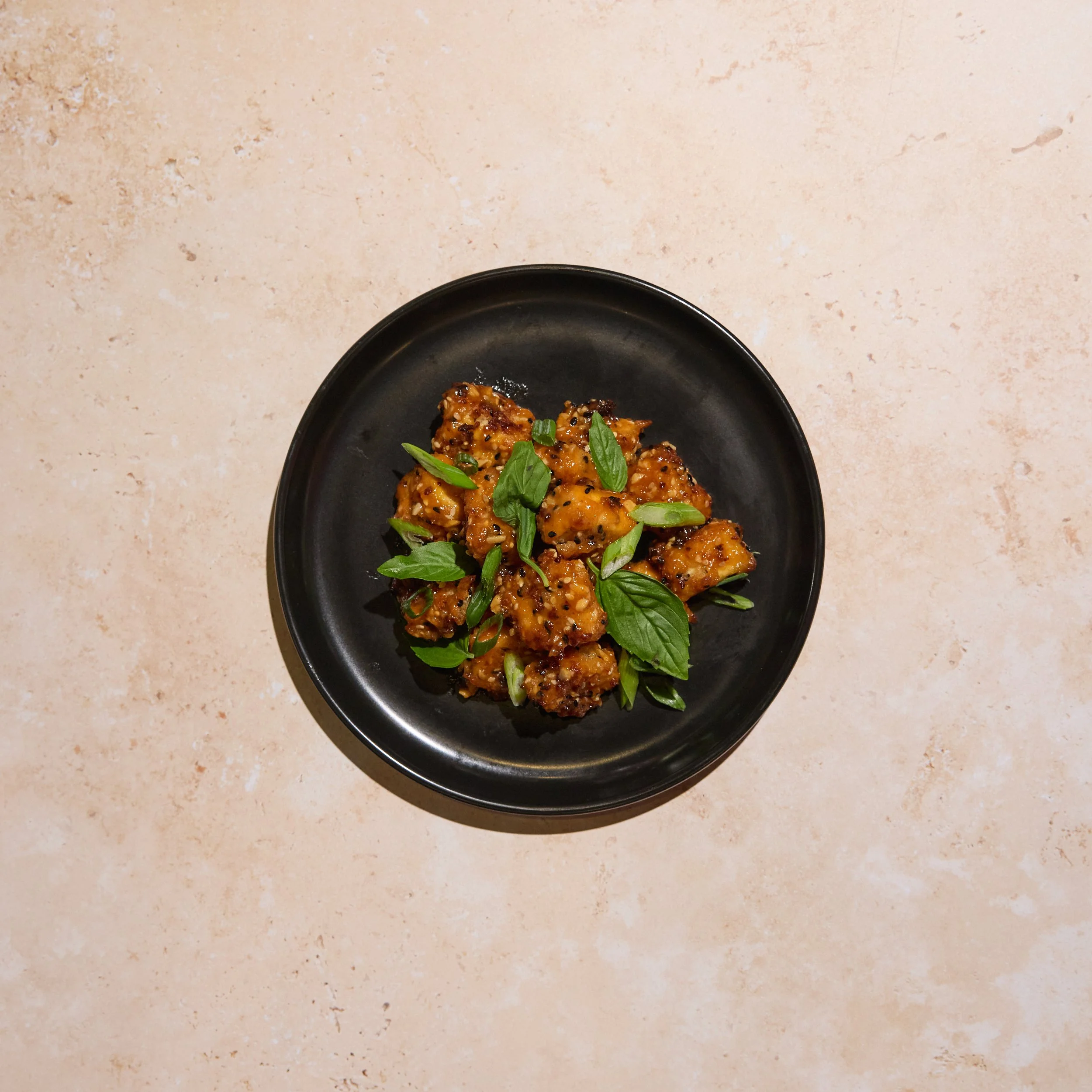 Crispy Tofu, Vegan Sesame Garlic Sauce, Basil, Green Onion.