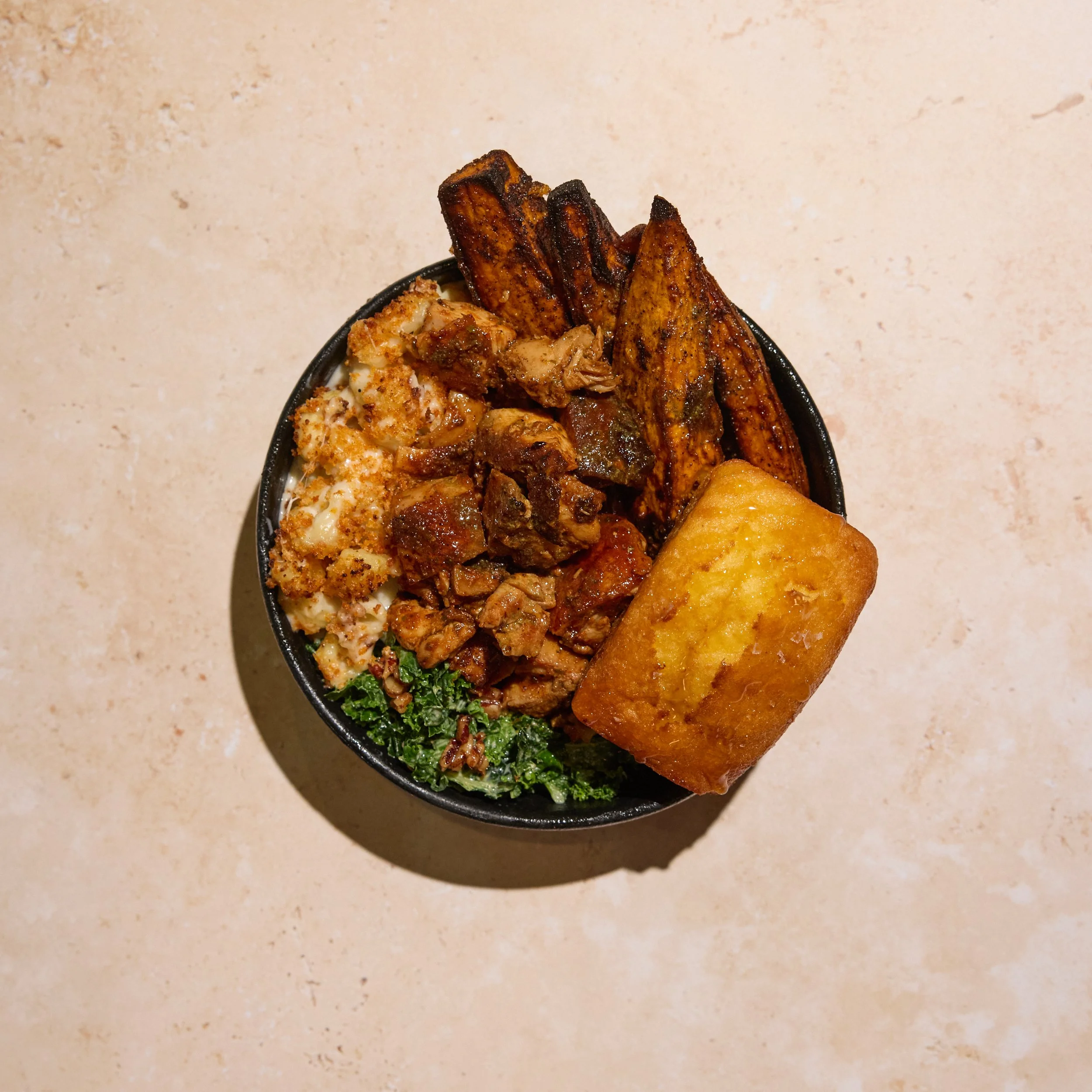 Honey BBQ Chicken Thigh, Roasted Sweet Potatoes, Pecan Kale Caesar, Mac & Cheese, Homemade Cornbread, Hot Maple Sriracha (Un)dressing.