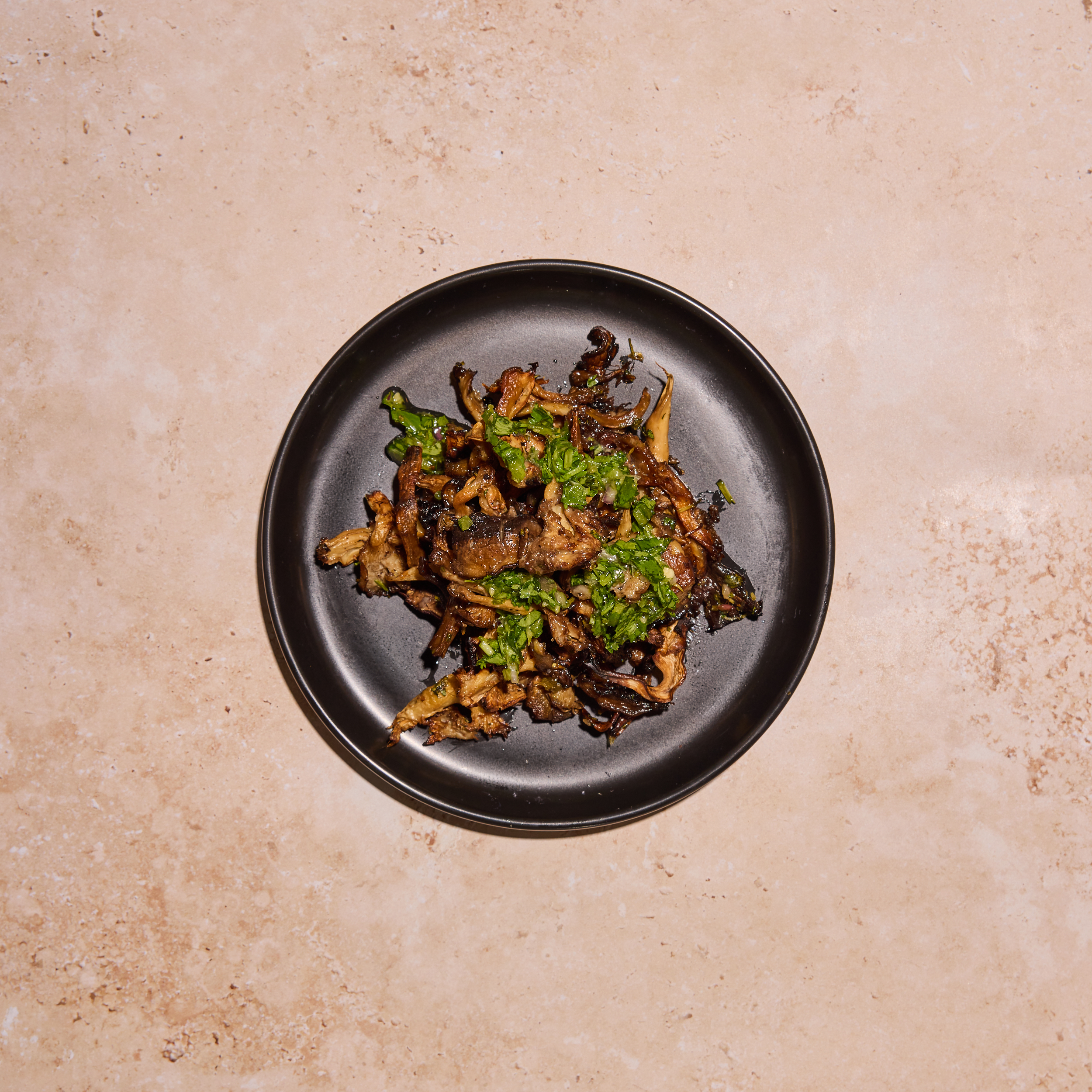 Roasted Blue Oyster & Portobello Mushroom, Sea Salt, Pepper, Cilantro Chimichurri.