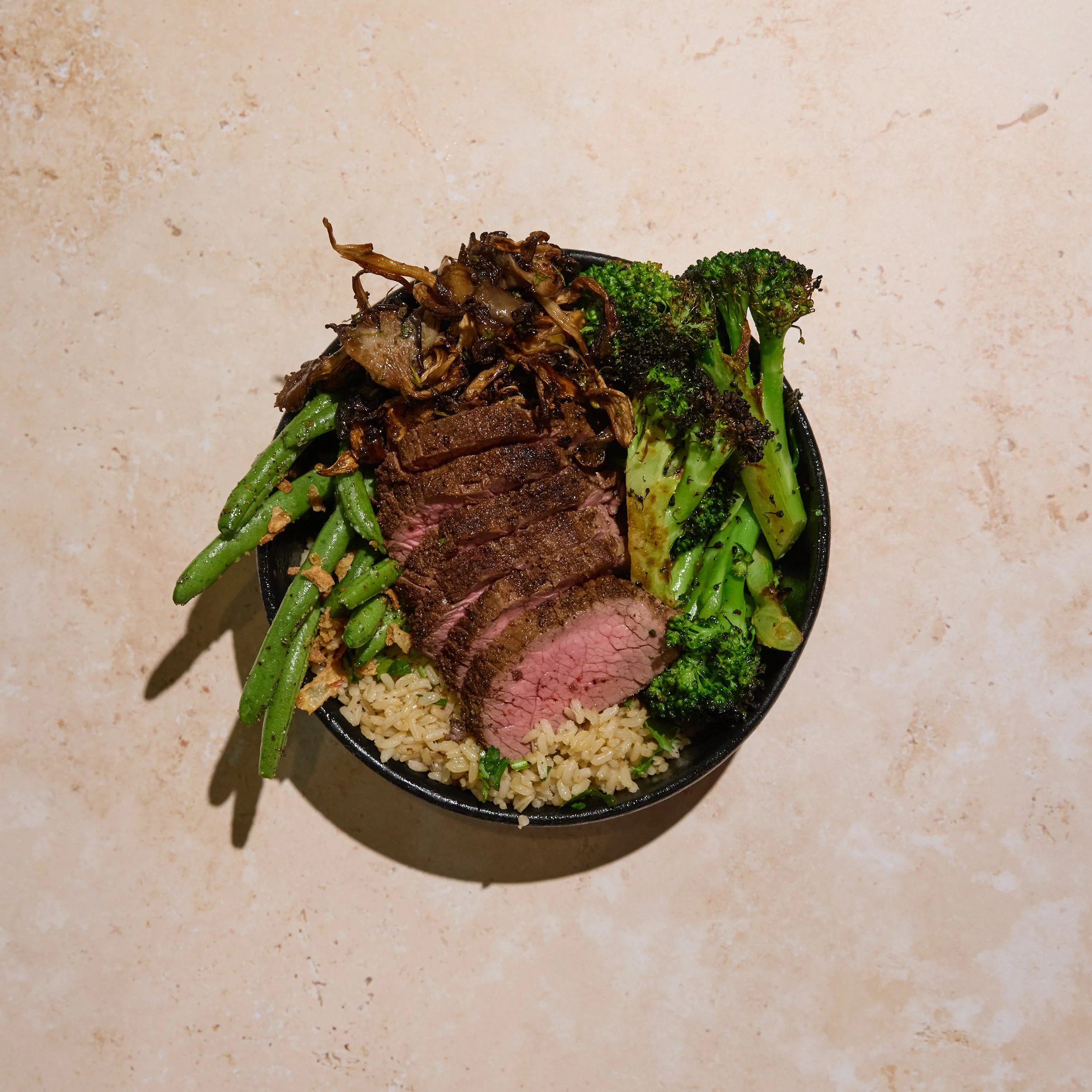 Grass-fed Steak, Blue Oyster Mushroom Mix, Charred Broccoli with Lemon & Garlic, Green Beans with Crispy Shallots, Green Goddess Caesar (Un)dressing.
