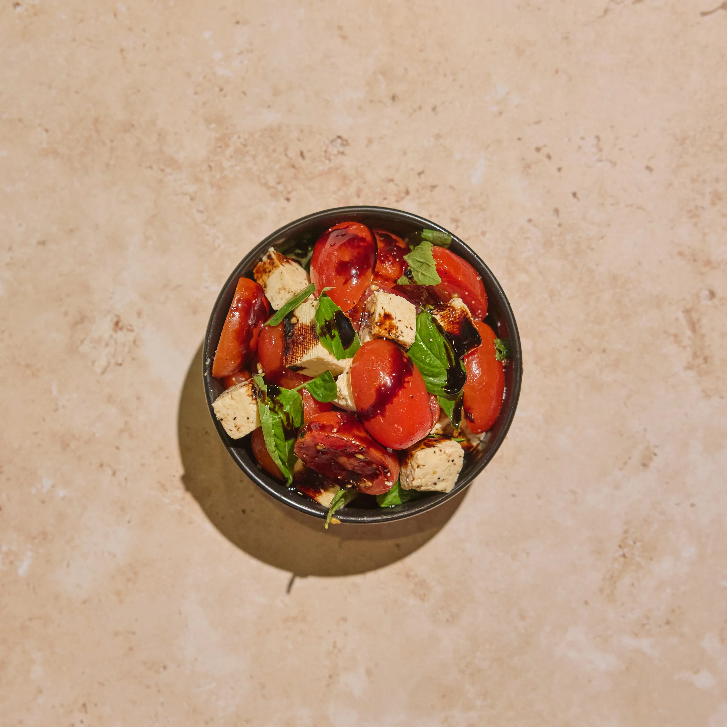 Grape Tomatoes, Marinated Tofu, Basil, EVOO, Balsamic.