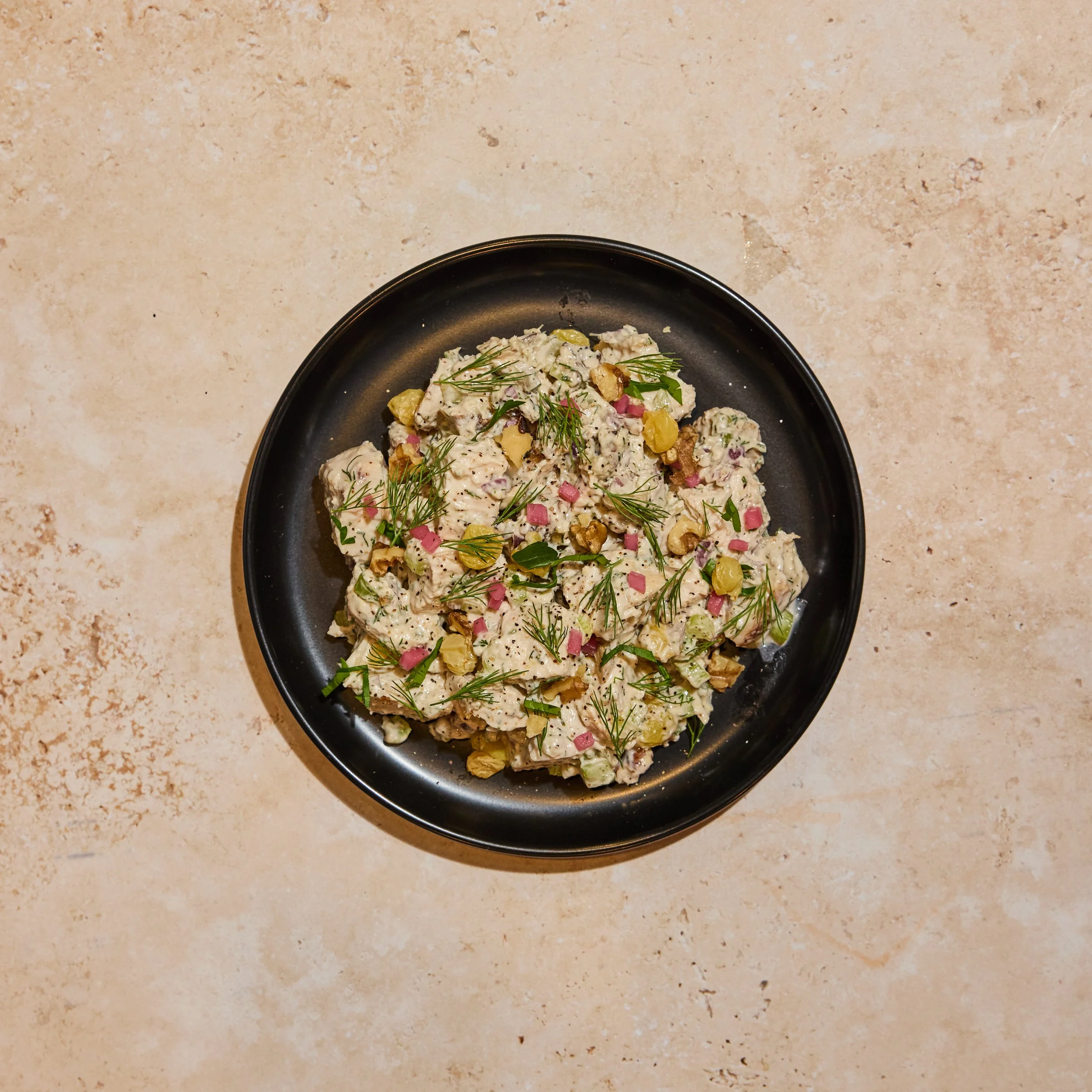 Roasted Chicken Breast, Vegan Mayo, Red Onion, Celery, Golden Raisins, Walnuts.